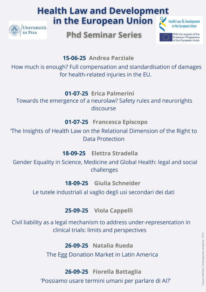 The seminars will cover civil liability for health-related injuries, the emerging field of neuro-law, a new conceptualisation of the right to personal data protection, gender equality in health global regulation, intellectual property rights on secondary uses of data, justice in clinical trials, egg donation in Latin America, and the use of ‘human’ lexicon when it comes to AI.